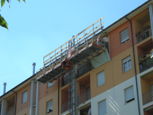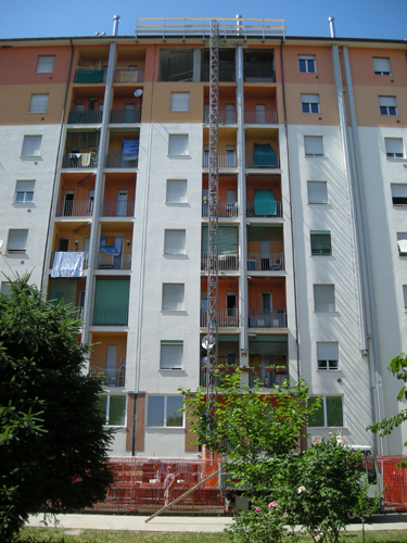 Nella seconda metà di maggio gli abitanti del Palazzone hanno visto spuntare un nuovo ponteggio sulla facciata del loro caseggiato. Si tratta di due piattaforme che consentiranno di completare la realizzazione di due alloggi sperimentali, all’ottavo piano delle scale 6 e 8. Oltre al consueto riattamento degli appartamenti, è prevista la posa di due grandi vetrate che affacciano sul cortile, progettate per garantire un buon risparmio energetico ai futuri inquilini.