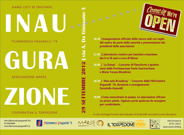 Sabato 29 settembre presso la piazzetta di via A.da Giussano che ospitò in passato la ParaFarmacia, sono state inaugurate le sedi di alcune associazioni, presenze vecchie e nuove in quartiere, In un doppio spazio è presente la Filarmonica Paganelli, che avrà come vicini di sede l’associazione Marse, la cooperativa sociale Il Torpedone e l’ associazione D’ArteFatti.