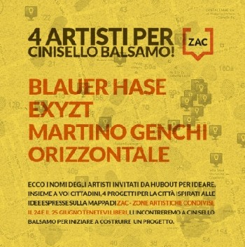 C’è tempo fino al 14 giugno per inserire le idee che riguardano la città di Cinisello Balsamo. Le idee caricate fin’ora sono oltre 100, su questioni e temi tra i più vari: cultura, spazi, servizi, verde e riqualificazione. Tra le più originali, ci sono senza dubbio le proposte dei bambini, che sognano più spazi per giocare, scuole di magia e luci colorate per rendere più sicure le zone malfamate. Conclusa questa fase di raccolta dei desideri se ne aprirà subito un’altra: il 24 e 25 giugno presso la Villa Forno, verranno presentati gli artisti scelti dal team di HubOut che, assieme ai cittadini, creeranno 4 progetti per la città ispirati alle idee espresse sulla mappa di ZAC. Volete un’anticapazione sugli artisti? Cercate i loro video sulla pagina facebook del gruppo HubOut. |