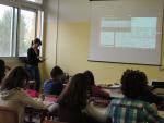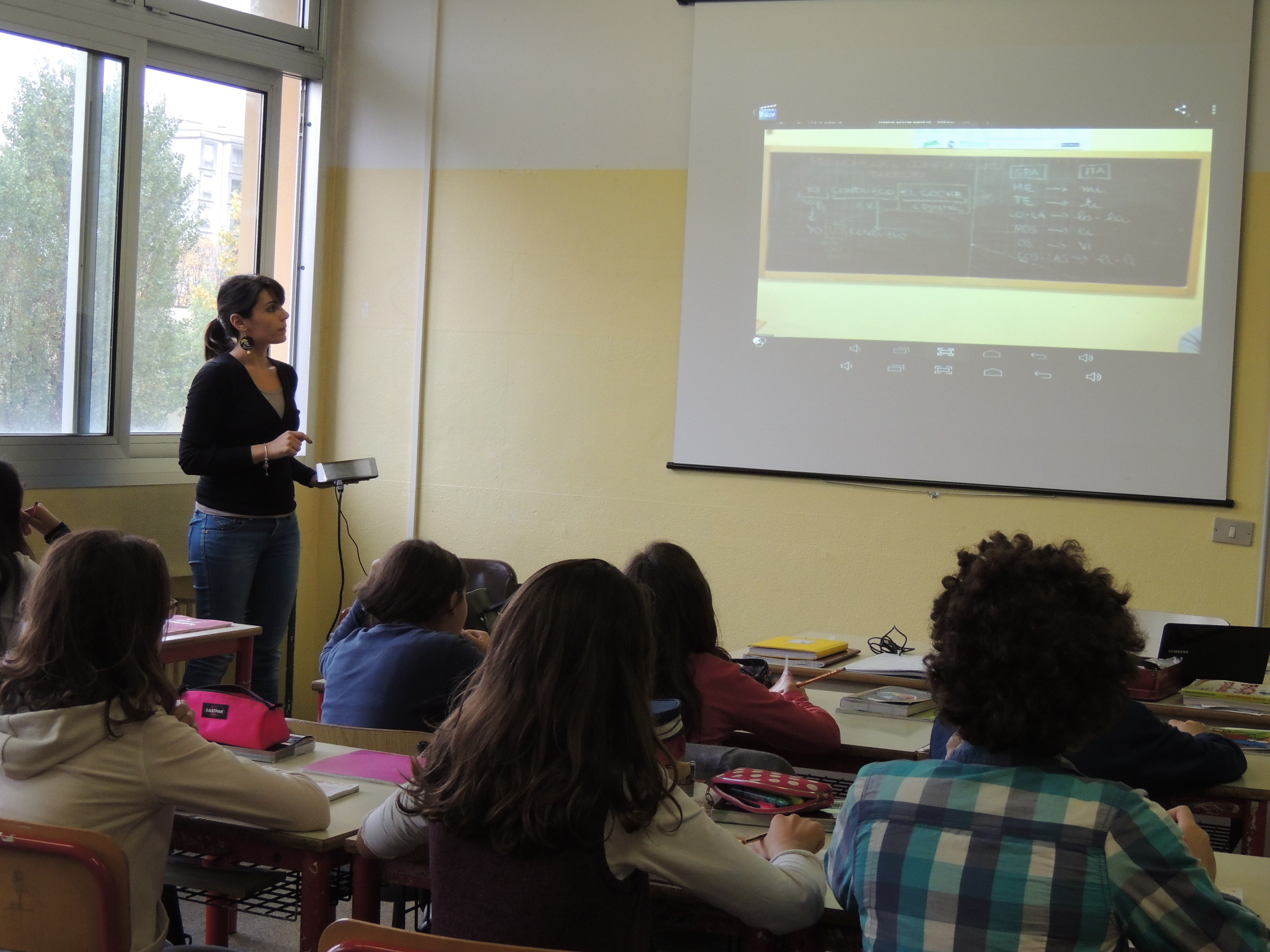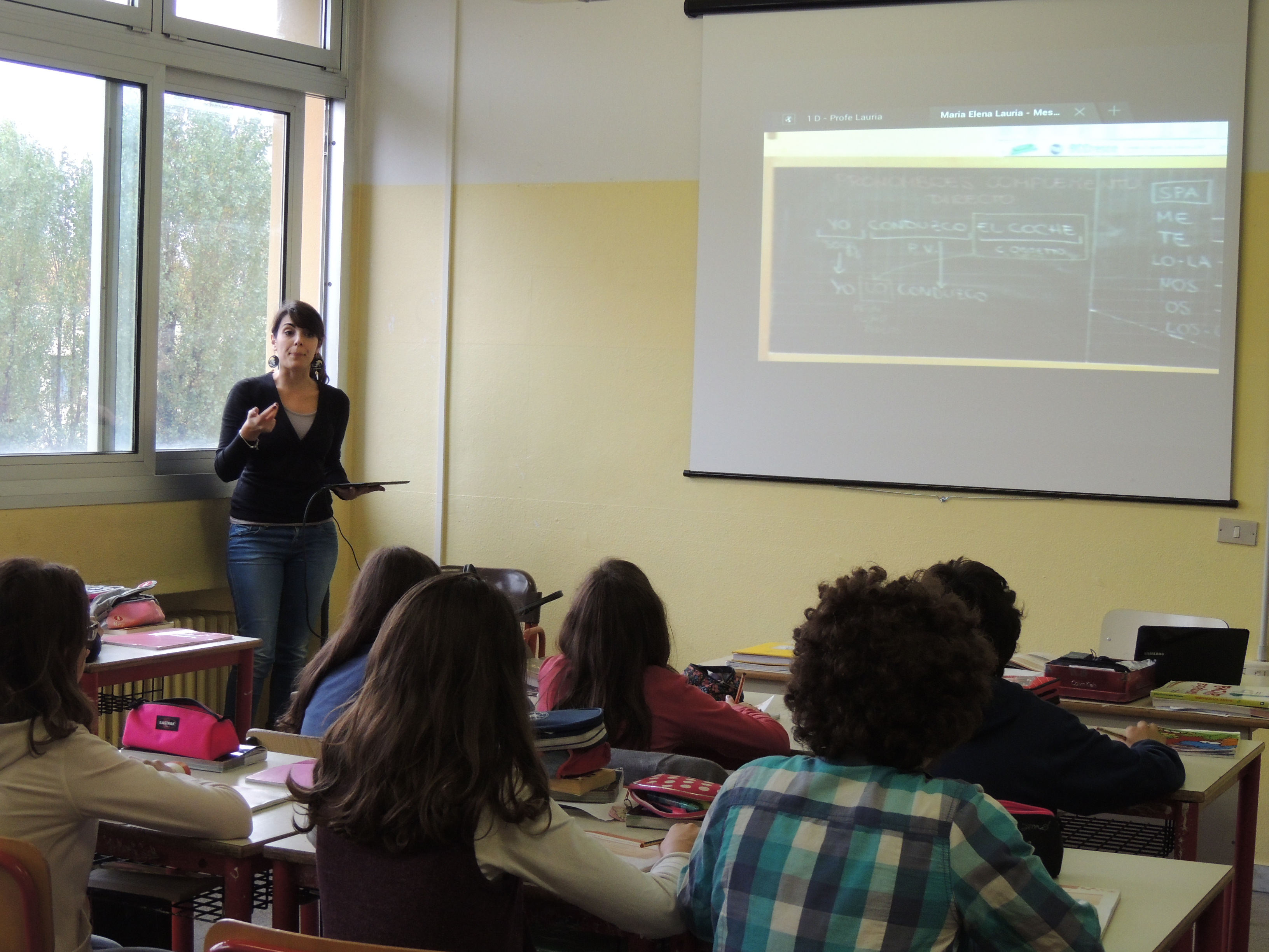 Le foto presentano un esempio di lezione d’aula in cui l’insegnante utilizza le strumentazioni in dotazione per riprodurre brani in lingua originale spagnola e presentare le regole grammaticali su una lavagna "alternativa".
