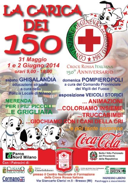 Il 31 maggio, 01 e 02 giugno 2014 la Croce Rossa Italiana festeggia i suoi 150 anni di attività (nasce a Milano il 15 giugno 1864) con una manifestazione ricca di proposte: mostre fotografiche ed interattive, esposizioni di mezzi operativi di Croce Rossa e dei Vigili del Fuoco, un corso informativo di disostruzione pediatrica rivolto a tutti i genitori. Inoltre, dedicati ai più piccoli ma non solo, sono previste “Pompieropoli” con i Vigili del Fuoco, dove i bambini indosseranno per un giorno elmetto e divisa affrontando un percorso di addestramento in miniatura imparando divertendosi, e “Ghisalandia” con la Polizia Locale di Milano dove poter apprendere, in un contesto ludico, le buone norme di comportamento stradale e di sicurezza sulla strada.