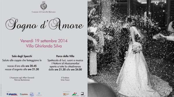 Un saluto e un intrattenimento che l’Amministrazione comunale vuole offrire alle coppie che in questi giorni hanno ricevuto l’invito a partecipare alla serata di venerdì 19 settembre 2014 intitolata “Sogno d’Amore”.