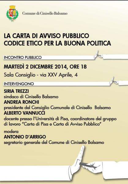 Il Consiglio comunale nella seduta del 11 novembre 2014 ha deliberato con atto n. 65 l’adesione alla Carta di Avviso Pubblico, il codice etico volto a garantire il rispetto dei principi di diligenza, lealtà, integrità, trasparenza, correttezza, obiettività e imparzialità all’interno delle Istituzioni pubbliche.