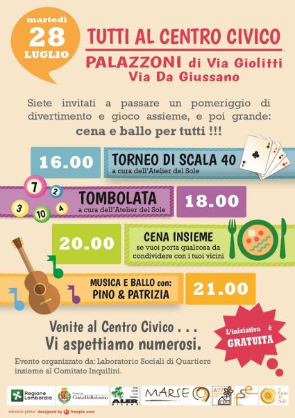 Bellissima giornata di festa al Centro Civico di via Giolitti. L’ l’Atelier del Sole, in collaborazione con i protagonisti dell’iniziativa ha organizzato le attività ludiche pomeridiane, un avvincente torneo di scala 40 e una tombolata alimentare, prima di apparecchiare e cenare tutti insieme. Numerosi i presenti, gli ospiti della Casa Del Sole, gli inquilini del caseggiato, alcuni nipotini e i rappresentanti di tutte le associazioni coinvolte. Un saluto all’estate con i fiocchi in una giornata all’insegna della collaborazione e del sostegno di tutti.
