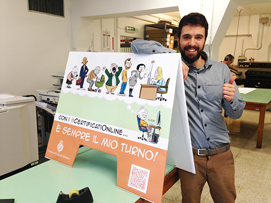 In particolare ricorda la campagna di promozione delle certificazioni online, che aveva come obiettivo far conoscere ai cittadini la procedura, utile a smaltire le lunghe code allo sportello e ridurre i relativi costi. "E’ stato il progetto che mi ha impegnato di più a livello di tempo e di cuore", racconta, in quanto impegnato anche nel disegno vero e proprio dei personaggi dei manifesti (tra i quali si possono riconoscere volti noti e una sportellista molto presa dagli utenti).