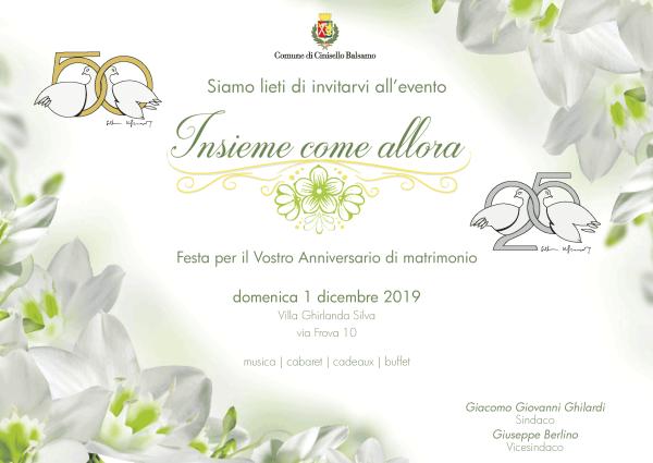 Tutte le coppie che nell’anno 2019 festeggiano il 25° e 50° anniversario di matrimonio sono invitate a partecipare all’evento "Insieme come allora", che si svolgerà domenica 1° dicembre in villa Ghirlanda Silva, via Frova 10.