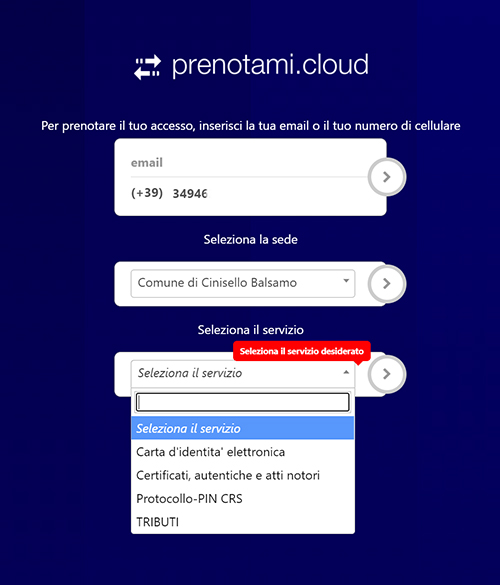 3) Seleziona la sede "Comune di Cinisello Balsamo" clicca su > e seleziona il servizio