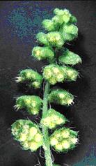 Fiori: verdastri sono portati da racemi terminali (lunghi 8-15 cm) che si estendono sopra le foglie della pianta. La formazione dei fiori è stimolata dall’allungarsi delle notti e nelle nostre zone la fioritura, con conseguente dispersione di polline, ha inizio verso la metà di luglio.