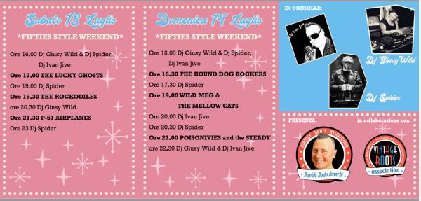 Un programma ricco di appuntamenti, con esibizioni di ballo, un ampio repertorio di 50’s Rock’n’Roll, Rockabilly, Rhytm’n’Blues, Swing, Boogie Woogie, Jump & Jive, DJ set , oltre che ad altre attrazioni quali moto, auto d’epoca, costumi e acconciature, mercatino vintage e stand gastronomici.