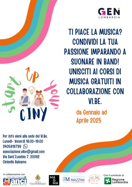 Continua la prima azione progettuale di “Start Up your Ciny” con i corsi di musica gratuiti gestiti dall’associazione Vi.Be. -Musica e Cultura, per dare ai giovani tra i 15 e i 34 anni un’opportunità di crescita e partecipazione attraverso l’attivazione di corsi musicali e strumentali che li educhino alla musica e all’arte.