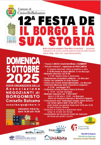 L’Associazione negozianti di Borgo misto in collaborazione con l’Amministrazione Comunale di Cinisello Balsamo organizza la “12° Festa del Borgo” che si terrà domenica 5 ottobre 2025 nel quartiere di Borgo misto.