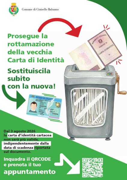Le vecchie carte di identità non sono più corrispondenti ai requisiti minimi di sicurezza richiesti, come da circolare n. 76/2025 del Ministero dell’Interno – Dipartimento per gli Affari Interni e Territoriali – Direzione Centrale per i Servizi Demografici, in attuazione del Regolamento (UE) n. 1157/2019.