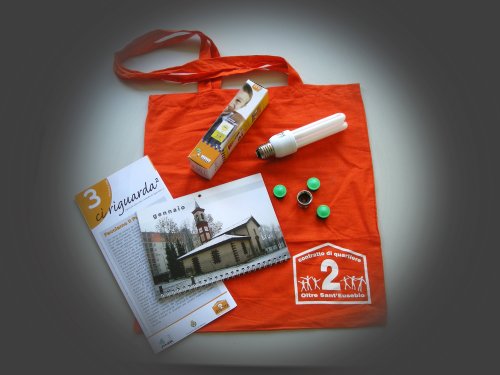 Abbiamo deciso di realizzare, con i colori caratteristici del Contratto di Quartiere 2, una utile "borsa milleusi" e con l’intento di proseguire nello sforzo comune per migliorare le condizioni di abitabilità del quartiere, grazie anche alla collaborazione del settore Ecologia e Ambiente del nostro comune e la società A2A, vi abbiamo inserito il "Kit del Cinisellese sostenibile". Riduttori di flusso per l’acqua e lampadine a basso consumo che contribuiranno a limitare i tuoi consumi e quindi a risparmiare.