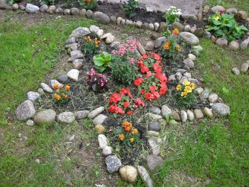 Grazie alla creatività di un inquilino, fantasiose decorazioni floreali rendono più gradevole un anfratto di cortile.