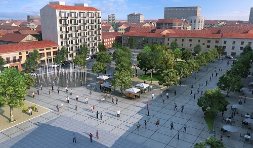 Le idee guida sono quelle di disegnare una piazza polivalente, con maggiori attrezzature per il tempo libero, un incremento del verde e un sistema di giochi d’acqua.
