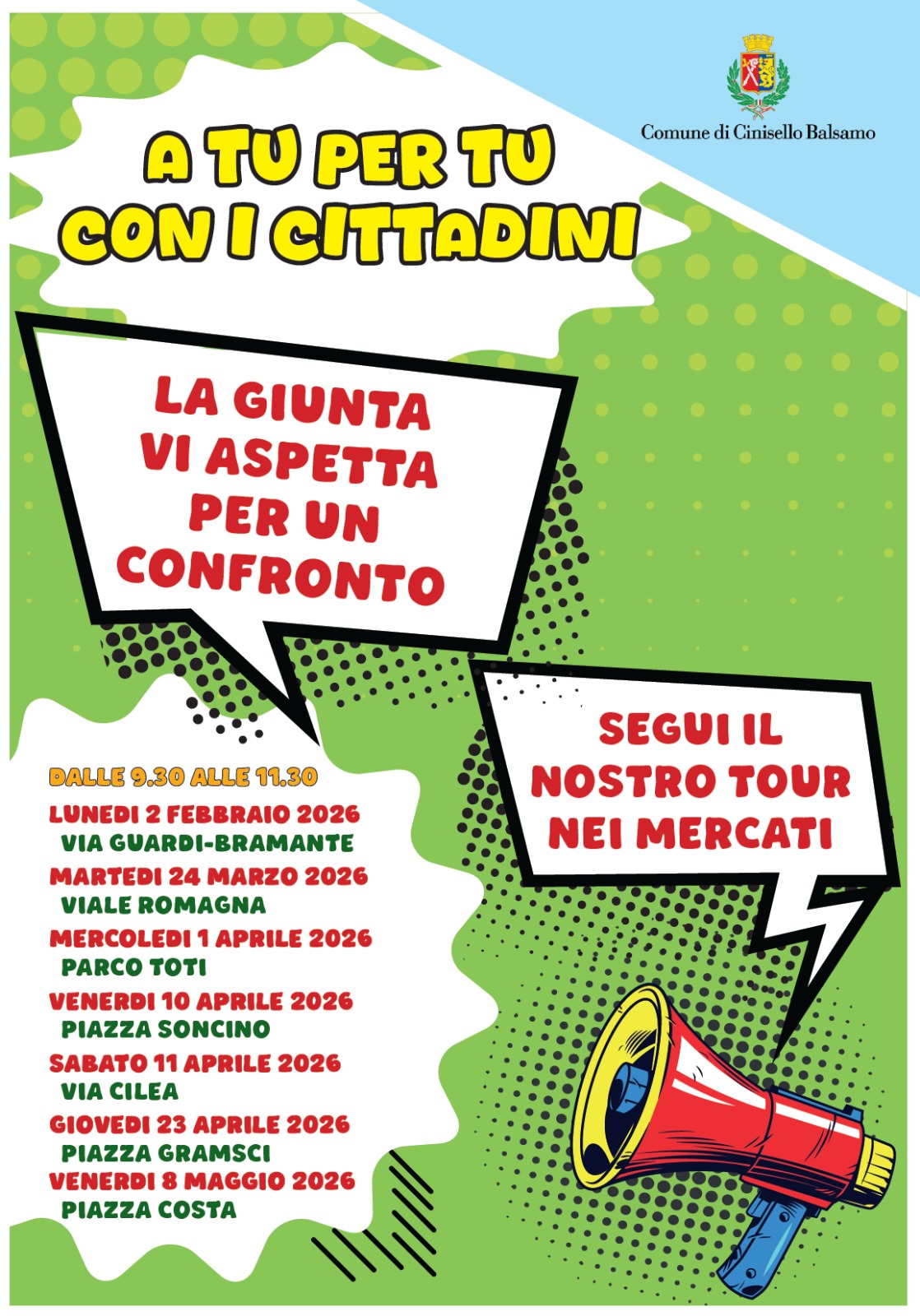 L’Amministrazione comunale riprende l’attività di ascolto sul territorio per l’anno 2026. Al fine di facilitare il dialogo diretto con i residenti, il Sindaco Giacomo Ghilardi e i componenti della Giunta effettueranno una serie di incontri itineranti presso i mercati rionali.