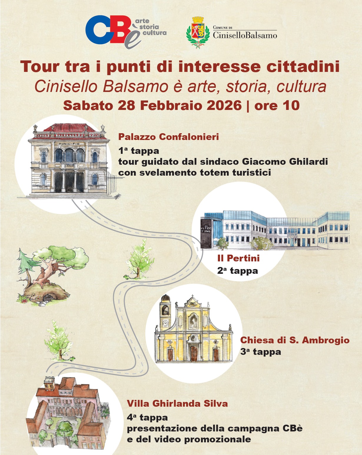 A seguire, il tour proseguirà presso il Centro Culturale Il Pertini e la Chiesa di Sant’Ambrogio, per poi concludersi presso Villa Ghirlanda Silva, nella Sala degli Specchi, dove è prevista la presentazione e la distribuzione della nuova mappa turistica di Cinisello Balsamo.