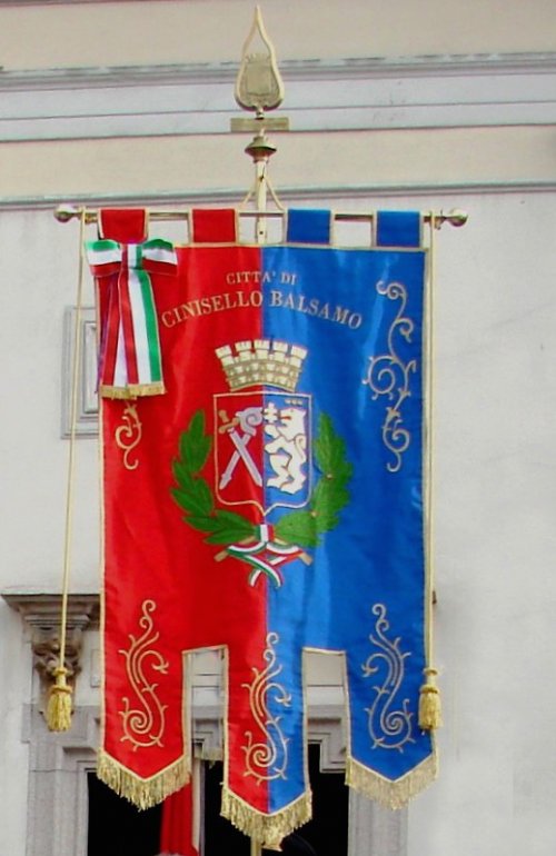 Il gonfalone, a coda di rondine, consta di un drappo rosso e azzurro riccamente ornato d’oro (dopo il conferimento del titolo di Città il gonfalone ha i fregi in oro, colore che contraddistingue le Città dai Comuni che hanno i fregi in argento, così come i merli della corona sono ora 5, al posto di 9 che caratterizzano i comuni) con impresso lo stemma comunale e con l’iscrizione in oro ‘Cinisello Balsamo’. I cordoni sono dorati, mentre le parti in metallo argentati; l’asta è ricoperta di velluto rosso e azzurro con bullette a spirale. E’ completato con nastri tricolori fregiati in oro.