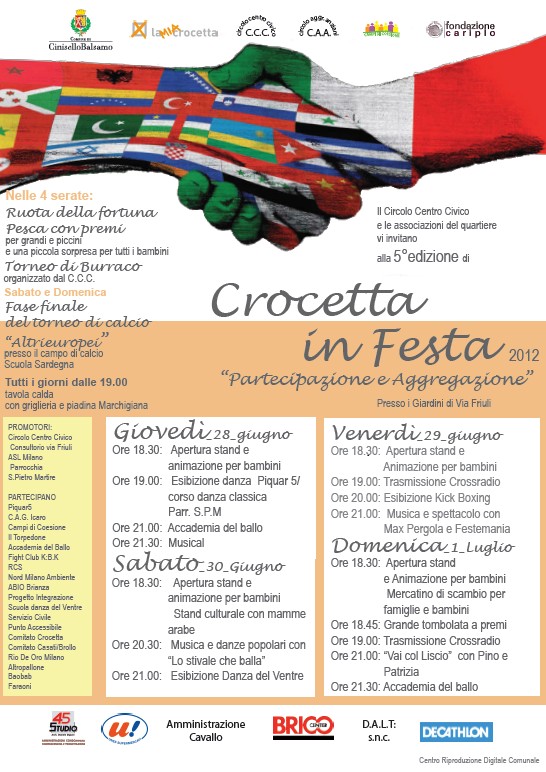 Da giovedì 28 giugno a domenica 1 luglio 2012 si svolgerà, presso i Giardini di Via Friuli a Cinisello Balsamo, la quinta edizione di “Crocetta in Festa”, manifestazione promossa all’interno del Progetto “La Mia Crocetta” dell’Amministrazione Comunale con il Circolo Centro Civico e le associazioni del quartiere con l’obiettivo di favorire la partecipazione e l’aggregazione degli abitanti della zona ma anche dell’intera cittadinanza.