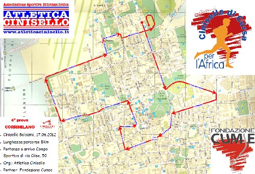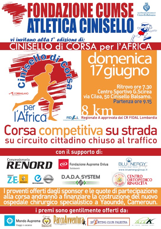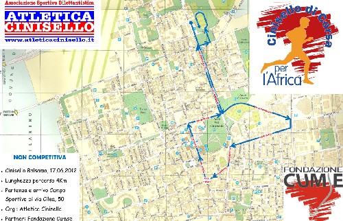 Domenica 17 giugno 2012 si terrà la prima edizione della gara su strada CINISELLO di CORSA per l’AFRICA organizzata dall’Associazione Sportiva ATLETICA CINISELLO e dalla Fondazione CUMSE Onlus con il patrocinio del Comune di Cinisello Balsamo, Settore Sport.