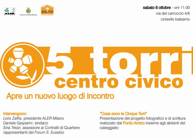 Sabato 6 ottobre alla presenza del rappresentante di Aler E. Galbiati, del Sindaco D. Gasparini e dell’assessore ai Contratti di Quartiere S.Trezzi, di una folta rappresentanza degli abitanti, del sindacato inquilini Sicet e di alcune associazioni cittadine si è inaugurato il nuovo Centro Civico delle 5 Torri.