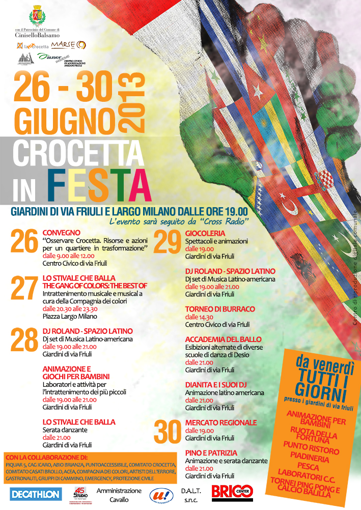 Dal 26 al 30 giugno 2013 Crocetta sarà in Festa! Attività, spettacoli, animazione, come ogni anno tutta la comunità è invitata dalle 19.00 alle 23.30 tra Largo Milano e via Friuli.