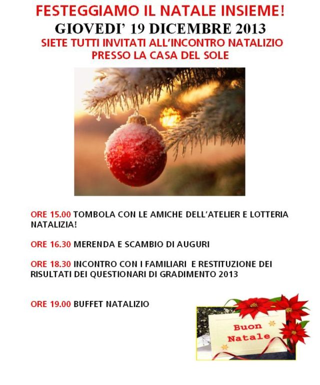 Giovedì 19 Dicembre si festeggerà presso la Casa del Sole l’arrivo delle festività natalizie: sarà l’occasione per scambiarsi gli auguri e partecipare alla tombola e alla lotteria natalizia, in compagnia degli ospiti della Casa del Sole e dell’Atelier.