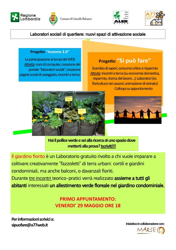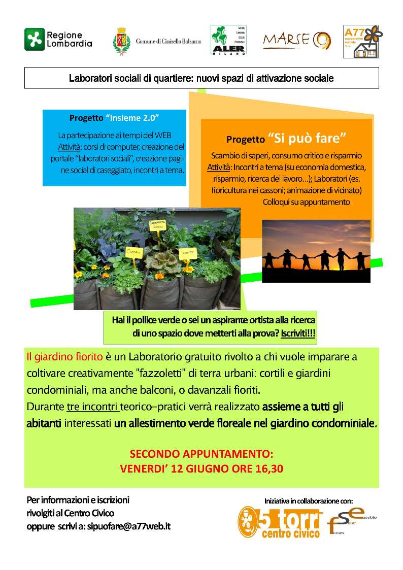 Il giardino fiorito è un Laboratorio gratuito rivolto a chi vuole imparare a coltivare creativamente "fazzoletti" di terra urbani: cortili e giardini condominiali, ma anche balconi, o davanzali fioriti.