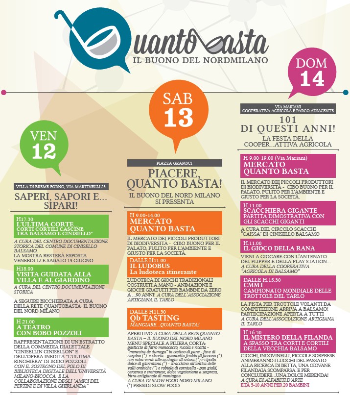 Un programma ricco di eventi a Cinisello Balsamo, il buono del Nordmilano si presenta! Mostre, eventi, mercatini dei piccoli produttori di biodiversità, giochi per bambini… Leggi qui il programma completo: PDF - 759.6 Kb.pdf 759.6 Kb Eventi Allegati IMG/pdf/quanto_basta.pdf .pdf 595.1 Kb - 10 giugno 2015