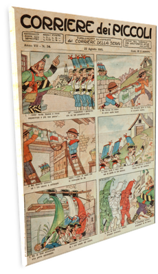 All’interno di questa situazione di enorme difficoltà si inseriva la propaganda che per la prima volta in modo massiccio utilizzava i bambini per far accettare a genitori e familiari un conflitto da molti non compreso e non voluto. I registri dei maestri testimoniano questa opera di coinvolgimento di bambini e ragazzi, opera intrapresa ancora di più da pubblicazioni a loro rivolte, in particolare dal Corriere dei Piccoli che si fece promotore di una continua e martellante azione di condizionamento dell’infanzia utilizzando a tal fine i suoi più abili disegnatori.