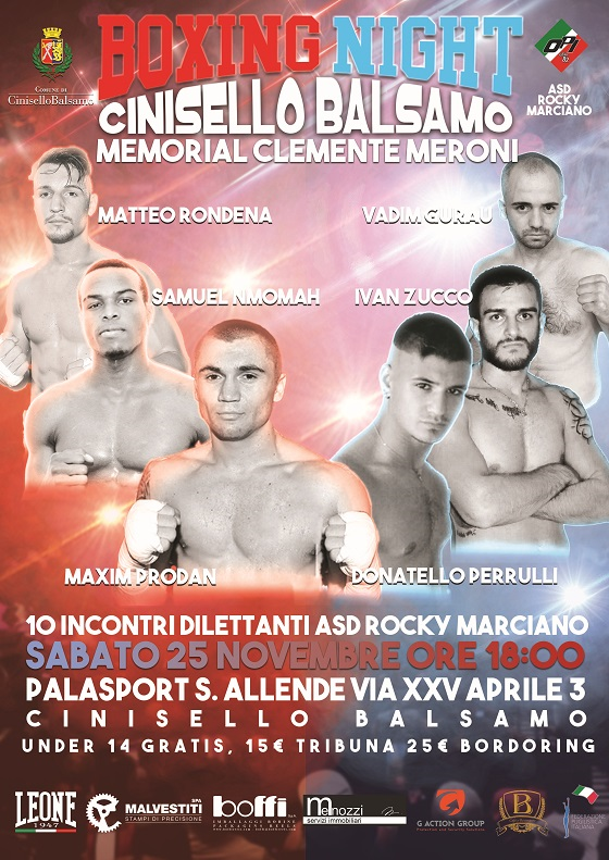 L’evento "Boxing Night - Memorial Clemente Meroni", avrà luogo sabato 25 novembre, presso il Palazzetto dello Sport S. Allende, organizzato dalla Rocky Marciano ASD in collaborazione con il Comune di Cinisello Balsamo.