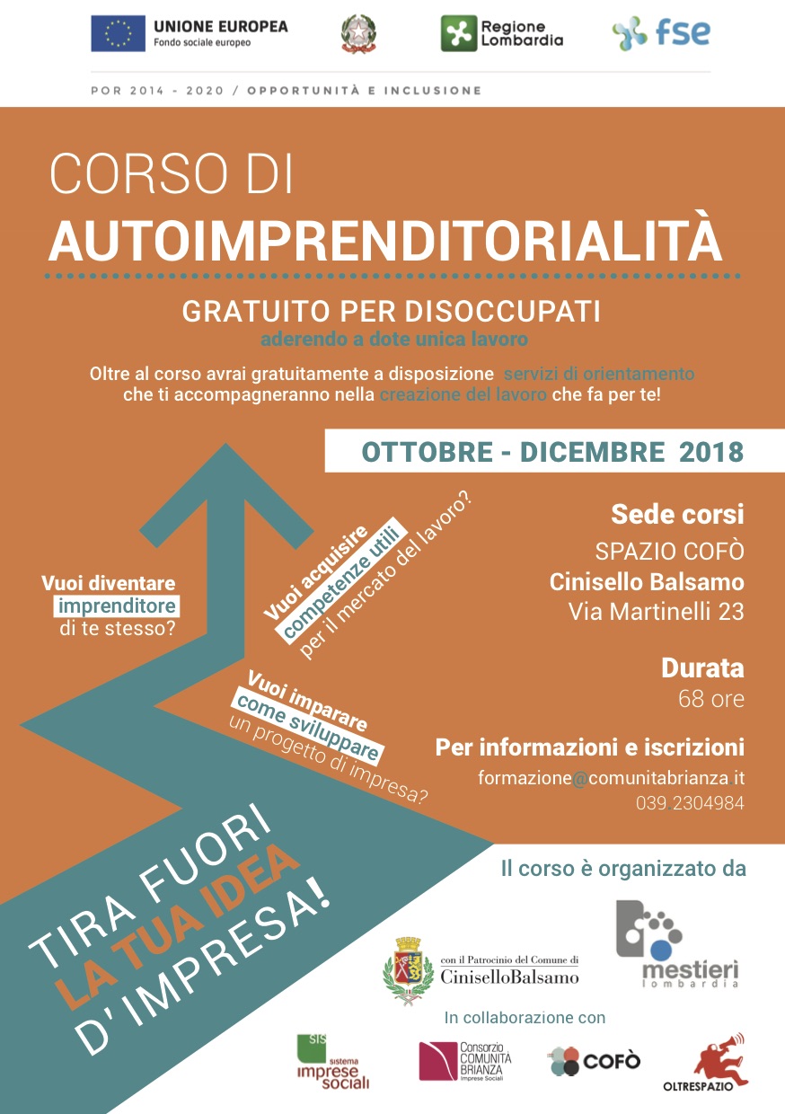 Interessante opportunità presso la struttura Cofò di Cinisello Balsamo. Infatti è qui che si terrà da ottobre a dicembre un corso di autoimprenditorialità della durata complessiva di 68 ore. L’iniziativa è gratuita per i disoccupati che aderiscono a dote lavoro, ma aperto anche a occupati alla quota di € 250.