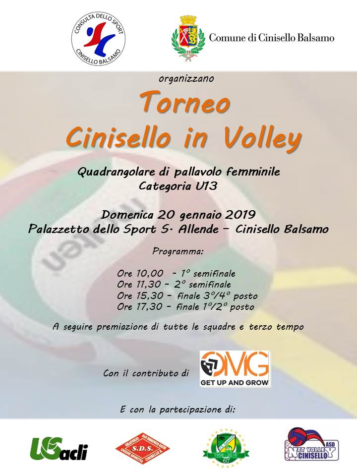 Domenica 20 gennaio 2019 si terrà un torneo quadrangolare di pallavolo femminile Categoria U13 (bambine anno 2006) presso il Palazzetto dello Sport S. Allende, via Aprile, 3 - Cinisello Balsamo.