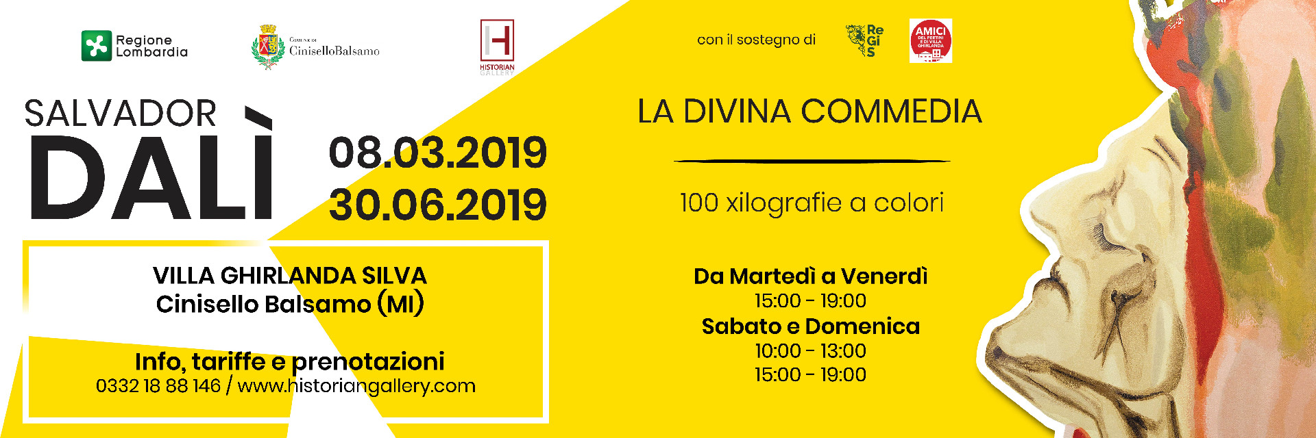 Nelle sale delle Quadrerie, all’interno della storica residenza di villa Ghirlanda Silva, verrà presentata un’esposizione di 100 xilografie originali di Salvador Dalì, con oggetto l’interpretazione della Divina Commedia. L’iniziativa è promossa dal Comune di Cinisello Balsamo in collaborazione con Historian Gallery SRL, con il supporto di ReGiS e l’associazione Amici del Pertini ed il patrocinio della Regione Lombardia.