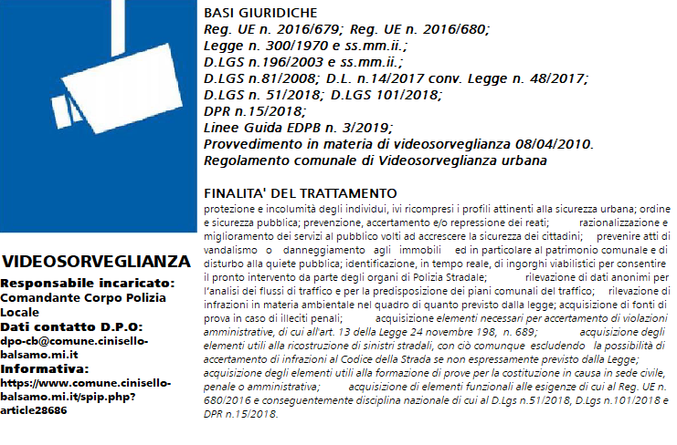 Le basi giuridiche su cui verte il sistema di videosorveglianza comunale sono: Reg. UE n. 2016/679; Reg. UE n. 2016/680; Legge n. 300/1970 e ss.mm.ii.; D.LGS n.196/2003 e ss.mm.ii.; D.LGS n.81/2008; D.L. n.14/2017 conv. Legge n. 48/2017; D.LGS n. 51/2018; D.LGS 101/2018; DPR n.15/2018; Linee Guida EDPB n. 3/2019; Provvedimento in materia di videosorveglianza 08/04/2010; Regolamento comunale di videosorveglianza urbana (DCC n.13 del 11/04/2022).