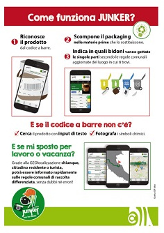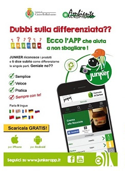 Junker è un’App da scaricare sui propri smartphone e tablet che aiuta a differenziare senza dubbi o errori gli scarti domestici. Come si utilizza? E’ semplice: prima riconosce ogni prodotto tramite il suo codice a barre o scrivendo la tipologia di rifiuto; quindi lo scompone nelle materie prime che lo costituiscono, indicando poi in quali bidoni queste ultime debbano andare gettate.