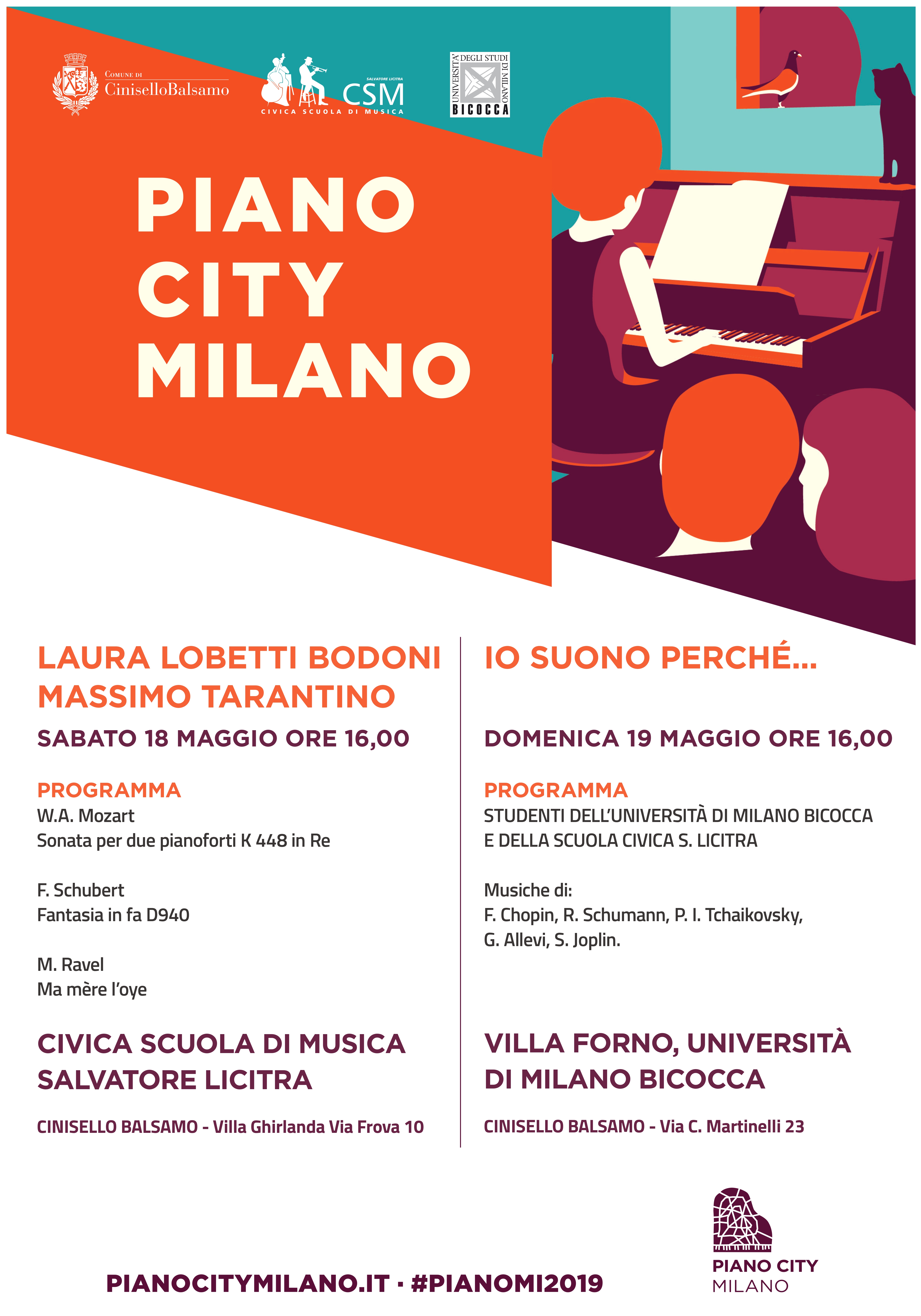 Si esibiranno, in occasione di Piano City 2019, il nostro docente Massimo Tarantino con Laura Lobetti Bodoni, e gli studenti dell’Università Bicocca di Milano assieme agli studenti della Civica Scuola di Musica Licitra.