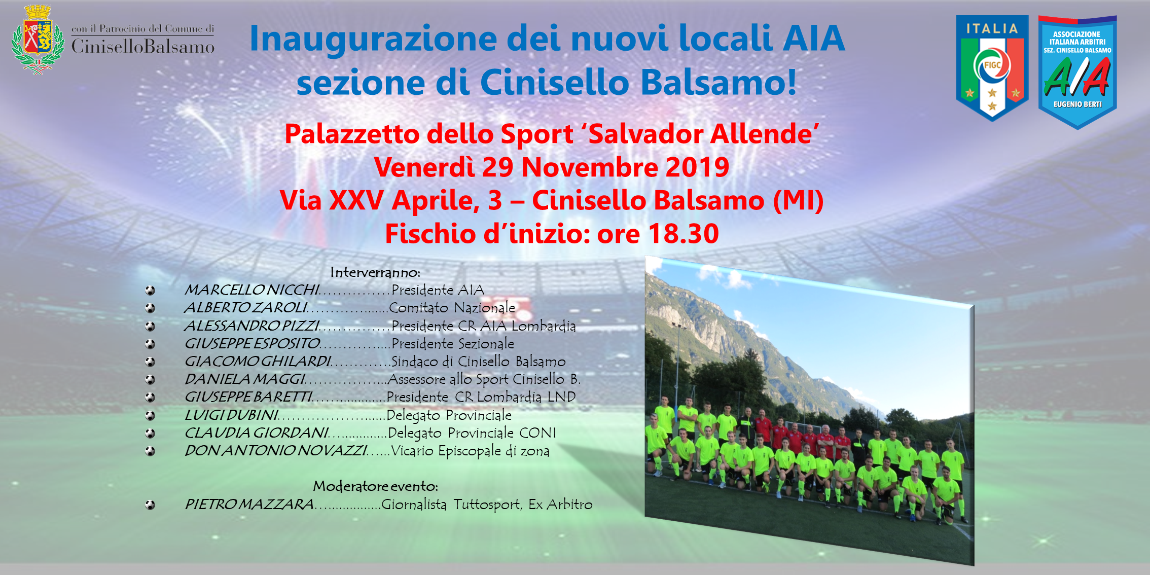 L’A.I.A., Associazione Italiana Arbitri, in collaborazione con l’Amministrazione Comunale, inaugura la nuova sede di Cinisello Balsamo sita presso il Palazzetto dello sport "Salvador Allende", l’evento avrà luogo venerdì 29 Novembre 2019 a partire dalle ore 18.30.