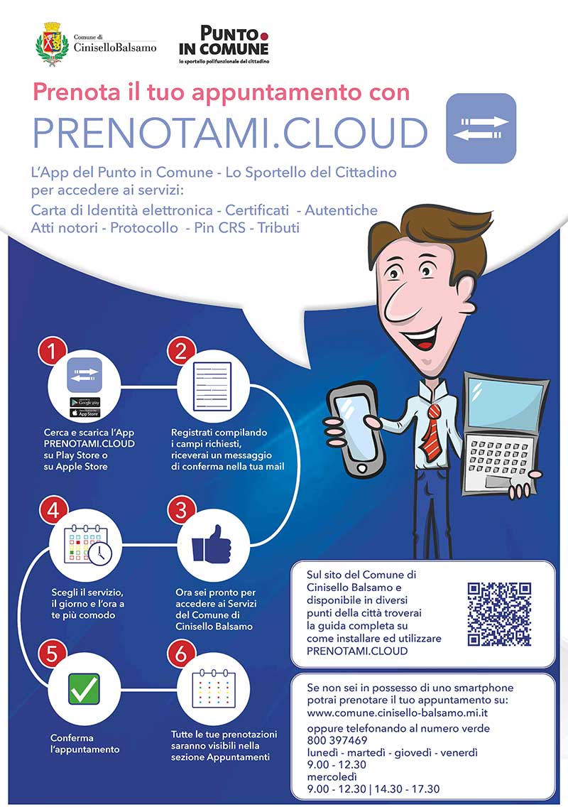 Con PRENOTAMI. CLOUD l’App del Punto in Comune puoi velocemente richiedere un appuntamento per la Carta di Identità elettronica, Certificati, Autentiche, Atti notori, Protocollo, Pin CRS e Tributi