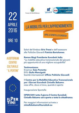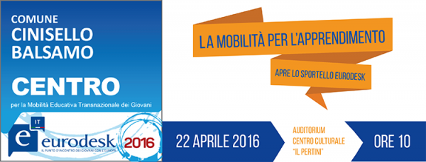 The new Eurodesk will be inaugurated on Friday, April 22nd, 2016 with an introduction event to the service starting at 10.00 am at the Auditorium of the Cultural Centre Il Pertini in Cinisello Balsamo.