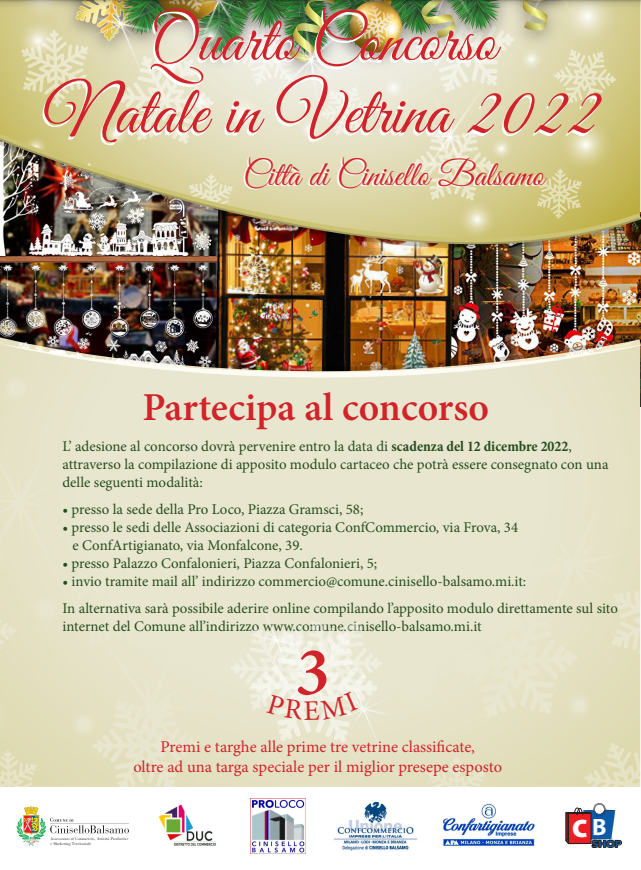 Se sei un commerciate di Cinisello Balsamo puoi iscriverti e partecipare addobbando la tua vetrina con il tema natalizio da te scelto, scatenando la tua fantasia e creatività. Il concorso è aperto a tutte le attività di vicinato commerciali, artigianali e pubblici esercizi, dotati di vetrina, ubicate sul territorio comunale.