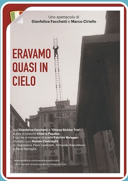 "ERAVAMO QUASI IN CIELO" uno spettacolo teatrale in programma il 12 maggio alle ore 21.00 presso l’Auditorium "Il Pertini" via XXV aprile 4 Cinisello Balsamo, uno spettacolo scritto e interpretato da Gianfelice Facchetti che narra un pezzo di storia dei Vigili del fuoco una storia che doveva trovare una sua memoria e che l’ha ritrovata in questo spettacolo. Il pubblico da un lato reagisce con sorpresa e stupore alla storia narrata, perché in realtà, pochi la conoscono; quando poi realizzano che è tutto vero ed è accaduto realmente, c’è una sorta di empatia con quella squadra, quella città e quel vissuto: un senso di rivalsa per un’ingiustizia di una vittoria che non ha mai trovato una collocazione fino in fondo nel calcio italiano:
