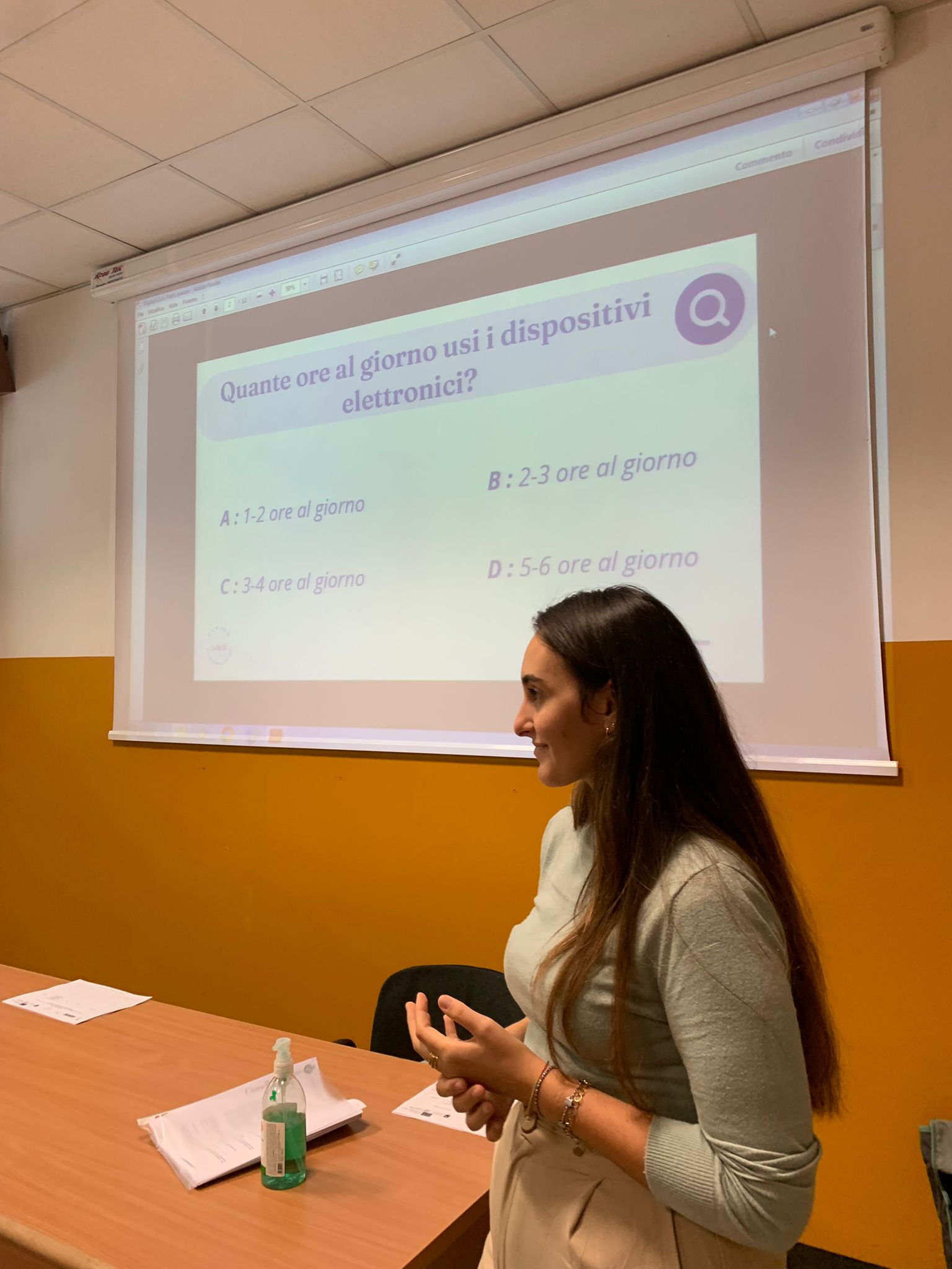 L’attività iniziale consisteva nel porre delle domande ai ragazzi sul loro uso personale degli strumenti digitali e come è cambiato il loro approccio al digitale durante il corso della pandemia. Le risposte erano strutturate a scelta multipla e in base alla risposta i ragazzi dovevano muoversi nei cartelloni preposti all’interno dell’aula. Questo movimento ha consentito di rompere il ghiaccio e iniziare a coinvolgere i ragazzi.