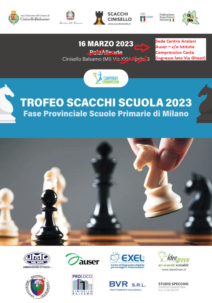 ASD Scacchi Cinisello con il supporto al Comitato Regionale Lombardo (CRL) e la Federazione Scacchi Italia (FSI) organizza a Cinisello per la giornata giovedì 16 marzo 2023 il TROFEO SCACCHI SCUOLA (TSS) Fase Proviciale Milano scuole primarie.