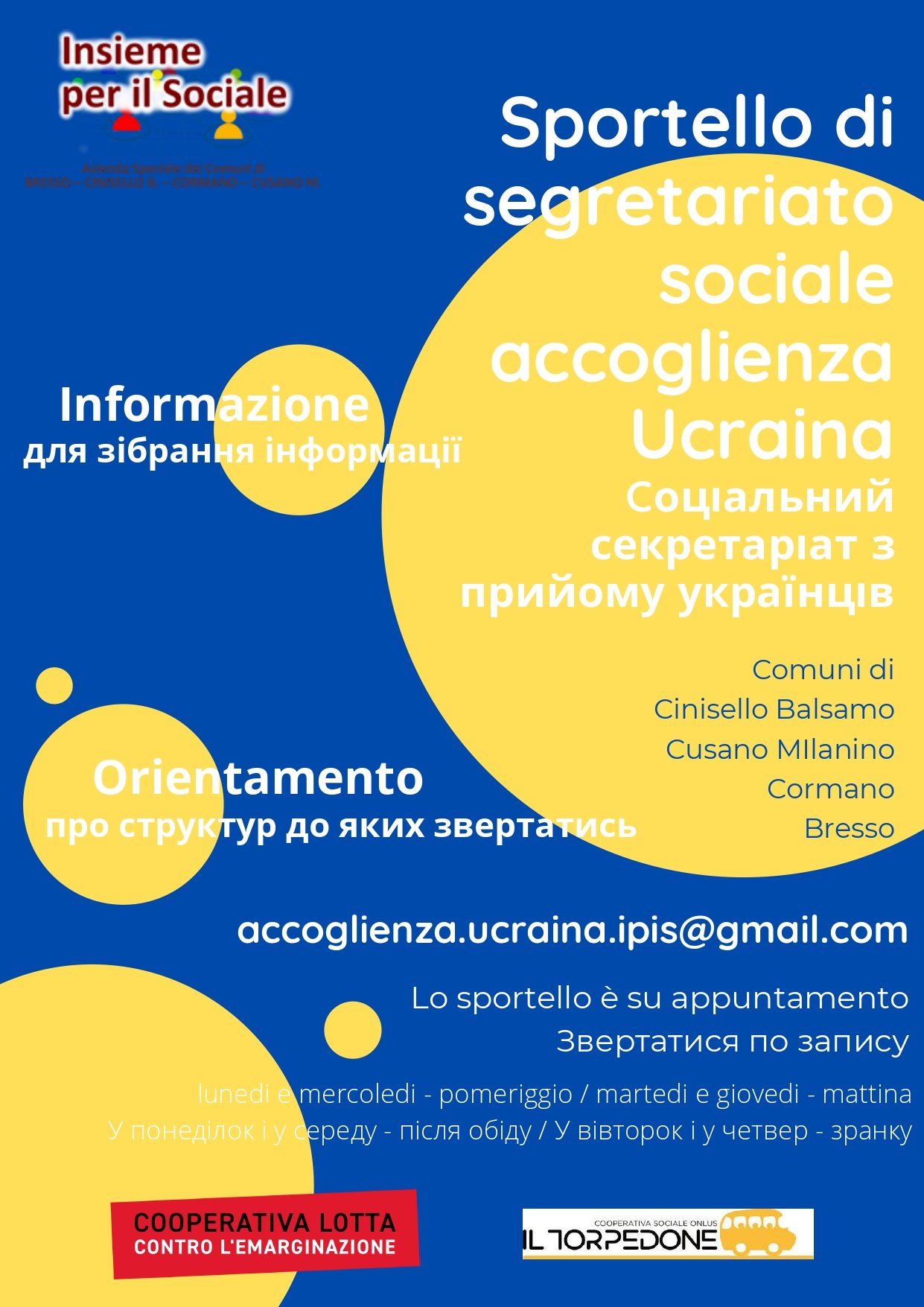 Aperto uno sportello di segretariato sociale per l’emergenza Ucraina e per le persone ucraine attualmente sui nostri territori. Per info, contatti, appuntamento scrivere ad accoglienza.ucraina.ipis@gmail.com Volantino.pdf 134.8 Kb