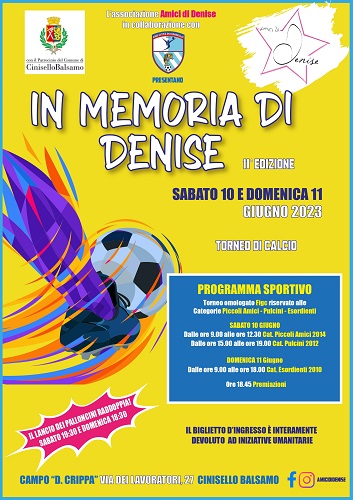 Il 10 e 11 giugno 2023 presso il centro sportivo “Crippa” di via dei Lavoratori si terrà un torneo di calcio in memoria di Denise Quattrocchi, ragazza cinisellese scomparsa prematuramente nel 2011.