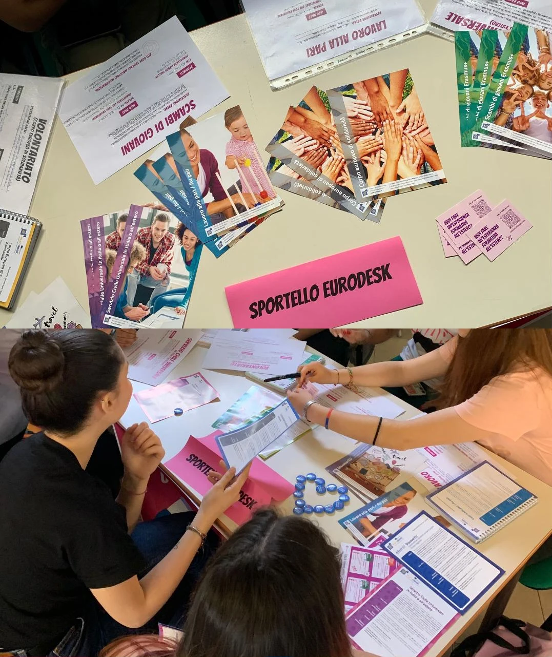 Durante l’attività sono stati creati degli sportelli Eurodesk gestiti dai ragazzi divisi a gruppi in quattro tavoli, ciascuno con volantini informativi per raccontare agli altri studenti le opportunità disponibili, tra cui scambi di giovani, lavoro alla pari, servizio civile universale, volontariato e DiscoverEU.