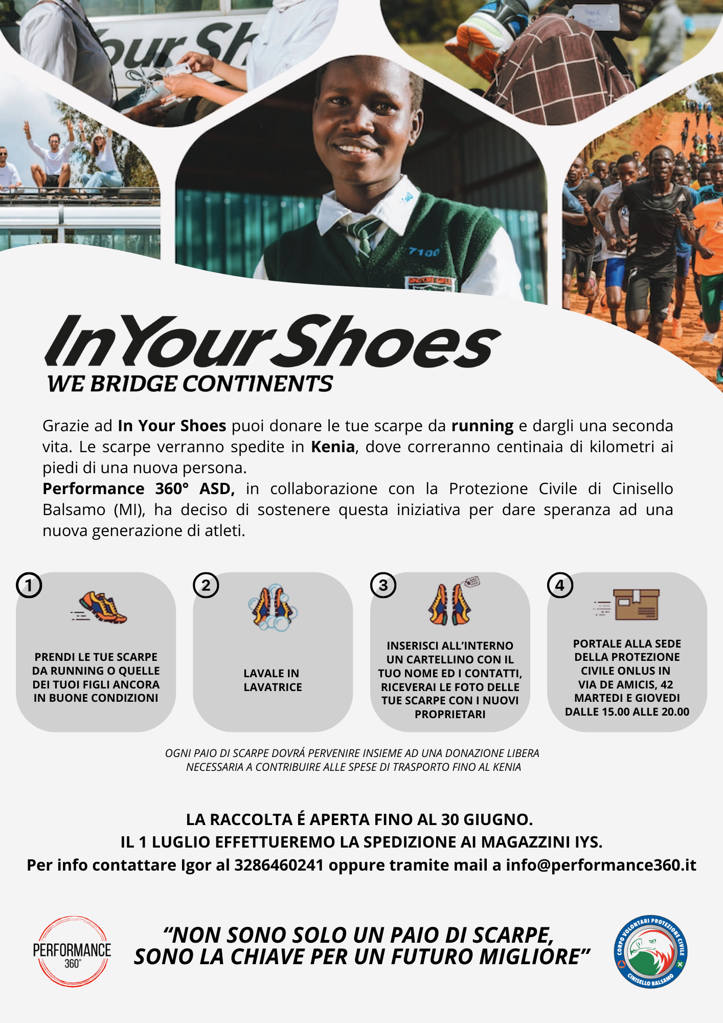 Igor Palla presidente dell’Associazione Performance 360°, in collaborazione con la Protezione Civile di Cinisello Balsamo, ha organizzato una raccolta scarpe per il progetto In Your Shoes Kenia, dopo una selezione delle scarpe ricevute sono state selezionate e partiranno da Cinisello 55 paia di scarpe con direzione Kenia. Un ottimo risultato, per info CLICCA QUI