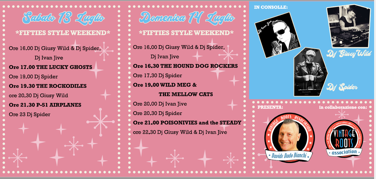 Un programma ricco di appuntamenti, con esibizioni di ballo, un ampio repertorio di 50’s Rock’n’Roll, Rockabilly, Rhytm’n’Blues, Swing, Boogie Woogie, Jump & Jive, DJ set , oltre che ad altre attrazioni quali moto, auto d’epoca, costumi e acconciature, mercatino vintage e stand gastronomici.