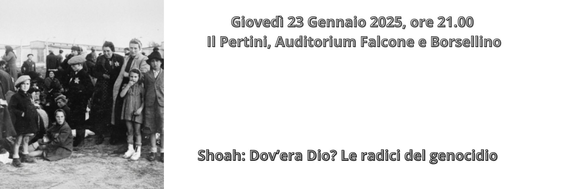 Una conferenza storica, intervallata ed arricchita da inserti musicali, spezzoni di film e brani letterari, per ripercorrere la verità storica sulla Shoah, indagando anche le radici culturali che ne sono all’origine. L’approccio fondamentalmente storico offrirà spunti per sostare sulle grandi domande che quel tragico evento ha suscitato e continua a suscitare: come è stato possibile un simile Male? Che cosa insegna a noi oggi? Le nostre certezze (religiose, filosofiche, esistenziali) ne sono scosse?